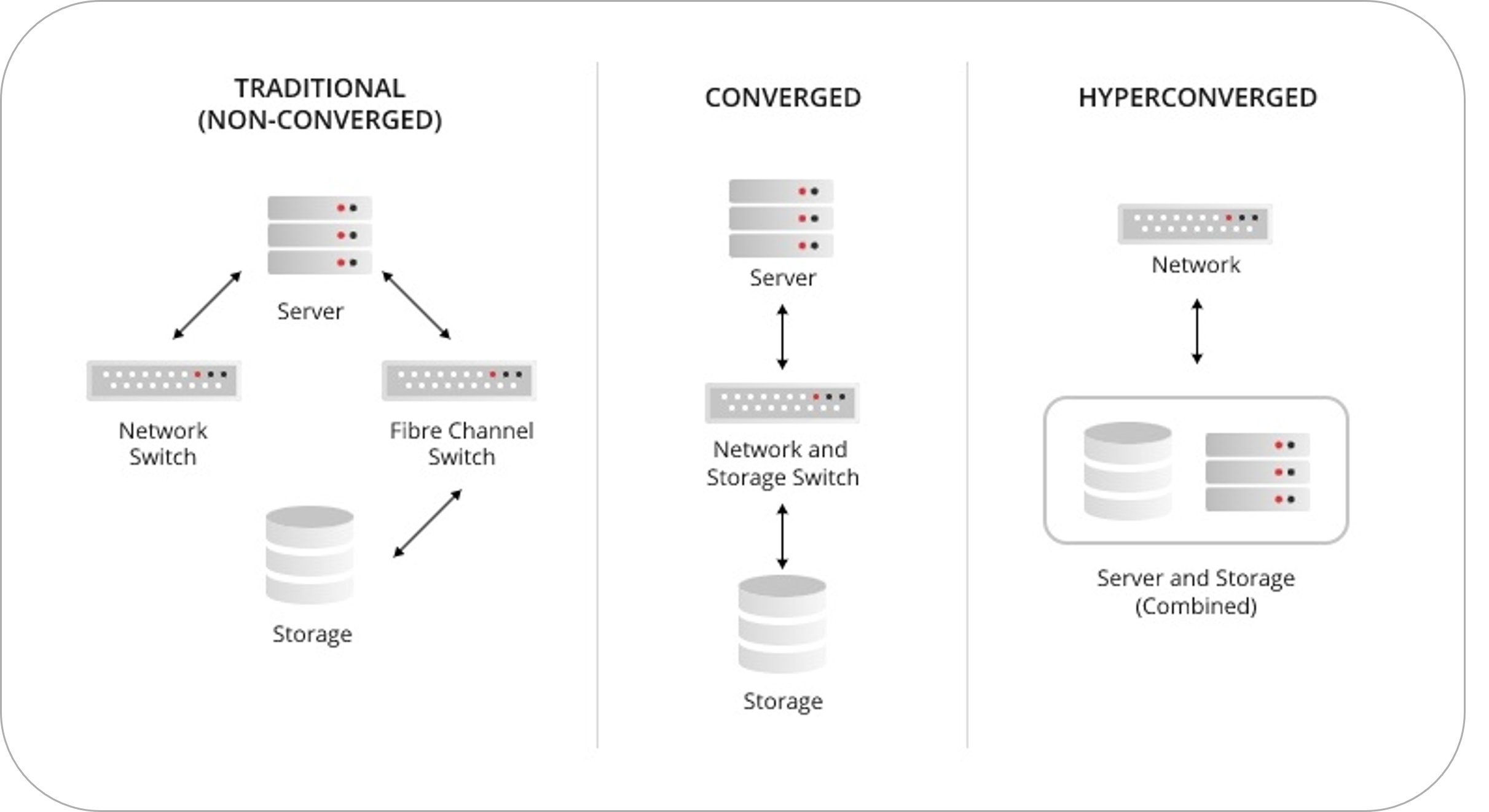 เป็นการรวม Compute + Storage เข้าไว้ด้วยกันและใช้ Software-defined ในการจัดการ Storage ในแต่ละ Server เหมาะสำหรับใช้งานเป็น Private Cloud ติดตั้งพวกระบบ VMware , Hyper-V หรือ KVM ที่เป็น Virtualization host โดยปกติระบบ HCI จะมี Physical Server จำนวนมากกว่า 2 Node ขึ้นไปเพื่อให้มีการ Redundancy ในกรณีที่บาง Node เกิดการเสียหาย